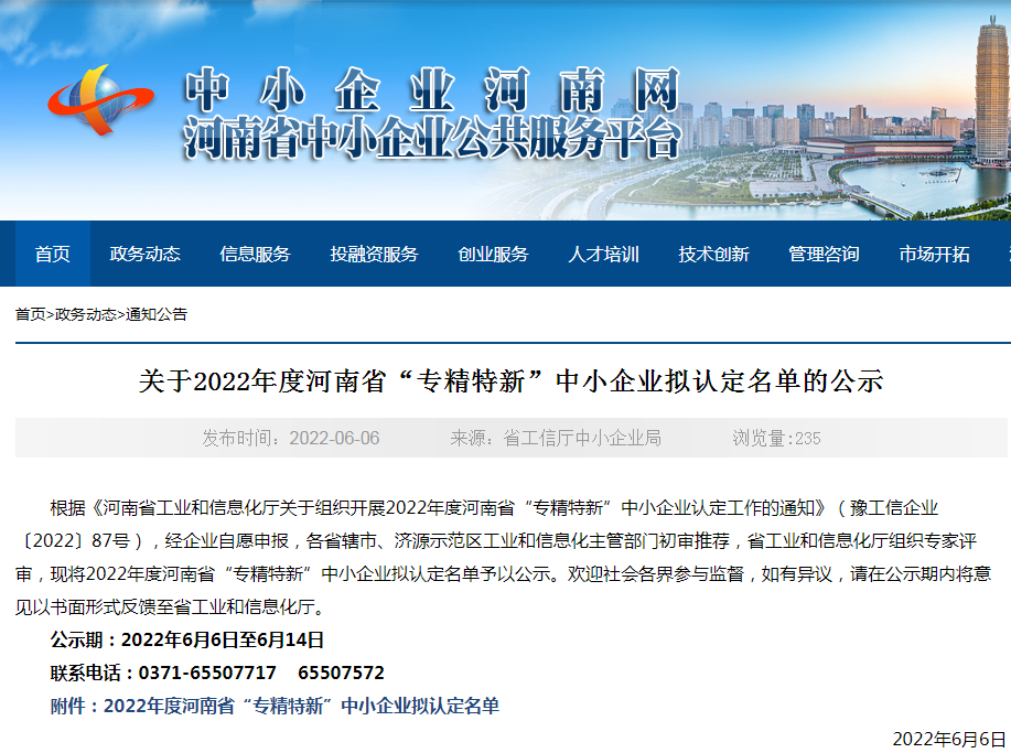 近日,河南省中小企業(yè)公共服務(wù)平臺(tái)對(duì)2022年度河南省“專精特新”中小企業(yè)擬認(rèn)定名單進(jìn)行公示。