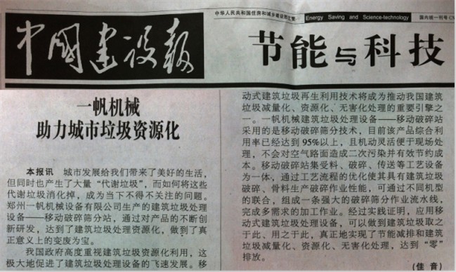 建筑垃圾可以資源化回收利用已經不是什么新聞,據(jù)中國建設報報道稱,我國城市建筑垃圾在鄭州一帆機械設備有限公司建筑垃圾處理設備的帶動下得到了良好的回收利用。