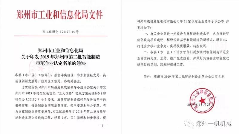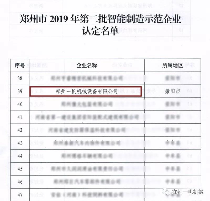 【榮譽(yù)】恭賀鄭州一帆機(jī)械設(shè)備有限公司入選鄭州市2019年第二批智能制造示范企業(yè)