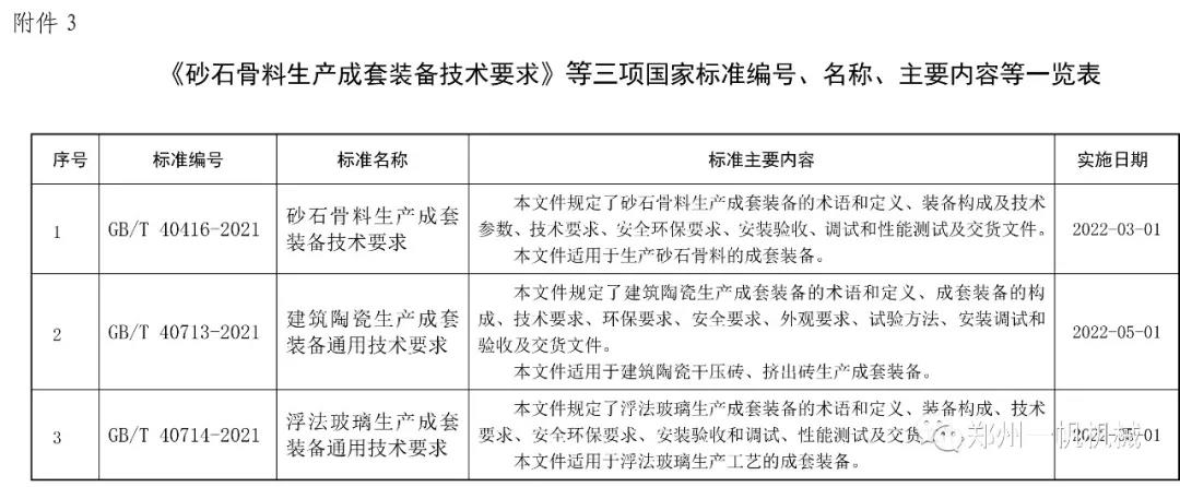 2021年10月20日,全國建材裝備標準化技術(shù)委員會頒布了關于實施《砂石骨料生產(chǎn)成套裝備技術(shù)要求》等三項國家標準的通知,其中鄭州一帆機械作為主起草單位參與了GB/T 40416-2021《砂石骨料生產(chǎn)成套裝備技術(shù)要求》國家標準的起草,此標準將于2022年3月1日起正式實施,將會對進一步規(guī)范砂石骨料等成套裝備的生產(chǎn)、提高產(chǎn)品質(zhì)量起到積極的作用。
